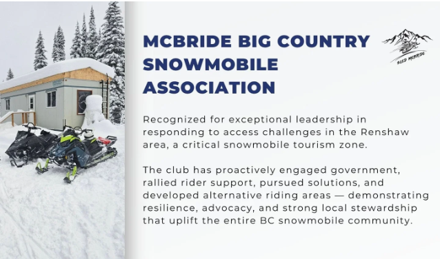 The club has a proactively engaged government, rallied rider support, pursued solutions, and developed alternative riding areas – demonstrating resilience, advocacy, and strong local stewardship that uplift the entire BC snowmobile community.” – BCSF